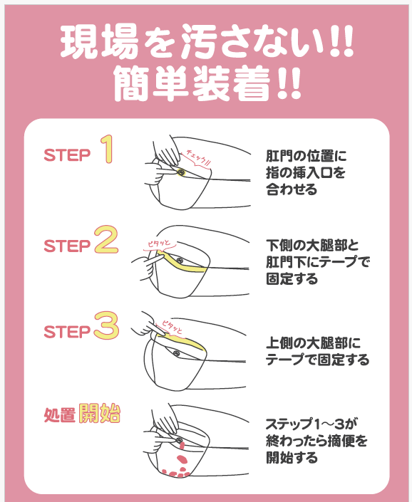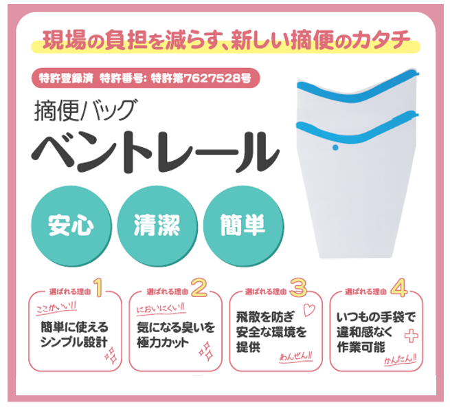 摘便バッグ(ベントレール) 新規開発 摘便とは・・・主に医療現場で行われる排泄援助の一つで、自力で排便が困難な患者さんの直腸内に停滞した硬い便を医師や看護師が指を使って直接取り除く行為です。その作業時に、患者・作業者の負担を軽減する商品を当社が開発しました。(特許商品) 規 格 22.5 × 34.5cm 両面テープ付き TEL:06-6203-7581 E-mail:kieigyo@imatecs.co.jp